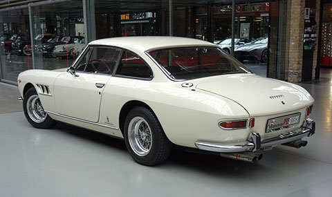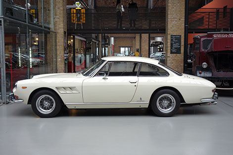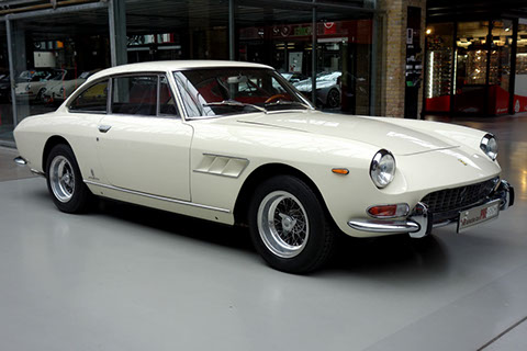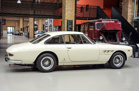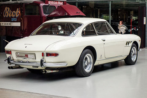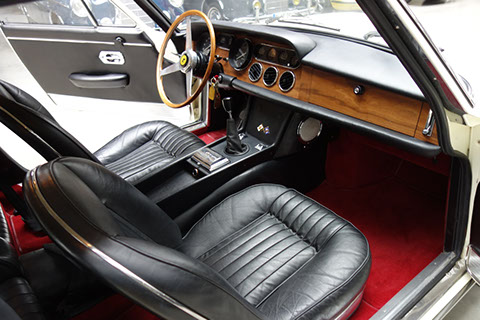 Hier sind auch alle Details vorhanden, die einen in den Zauber der absoluten Luxusklasse der 60er Jahre hineinbringen: weit ausgestellte Borrani-Speichenräder, der weltweit einzigartige Klang des rasselnd-röchelnden Colombo V12-Motors, perfektioniert durch die Ansa 4-Rohr Auspuffanlage, innen ein wunderschönes NARDI-Holzlenkrad, die faszinierenden Veglia-Instrumente und der umfangreich in Connolly-Leder ausgestattete Innenraum sind unnachahmliche Zeugen einer wirklich grossen Zeit des italienischen Automobilbaus.